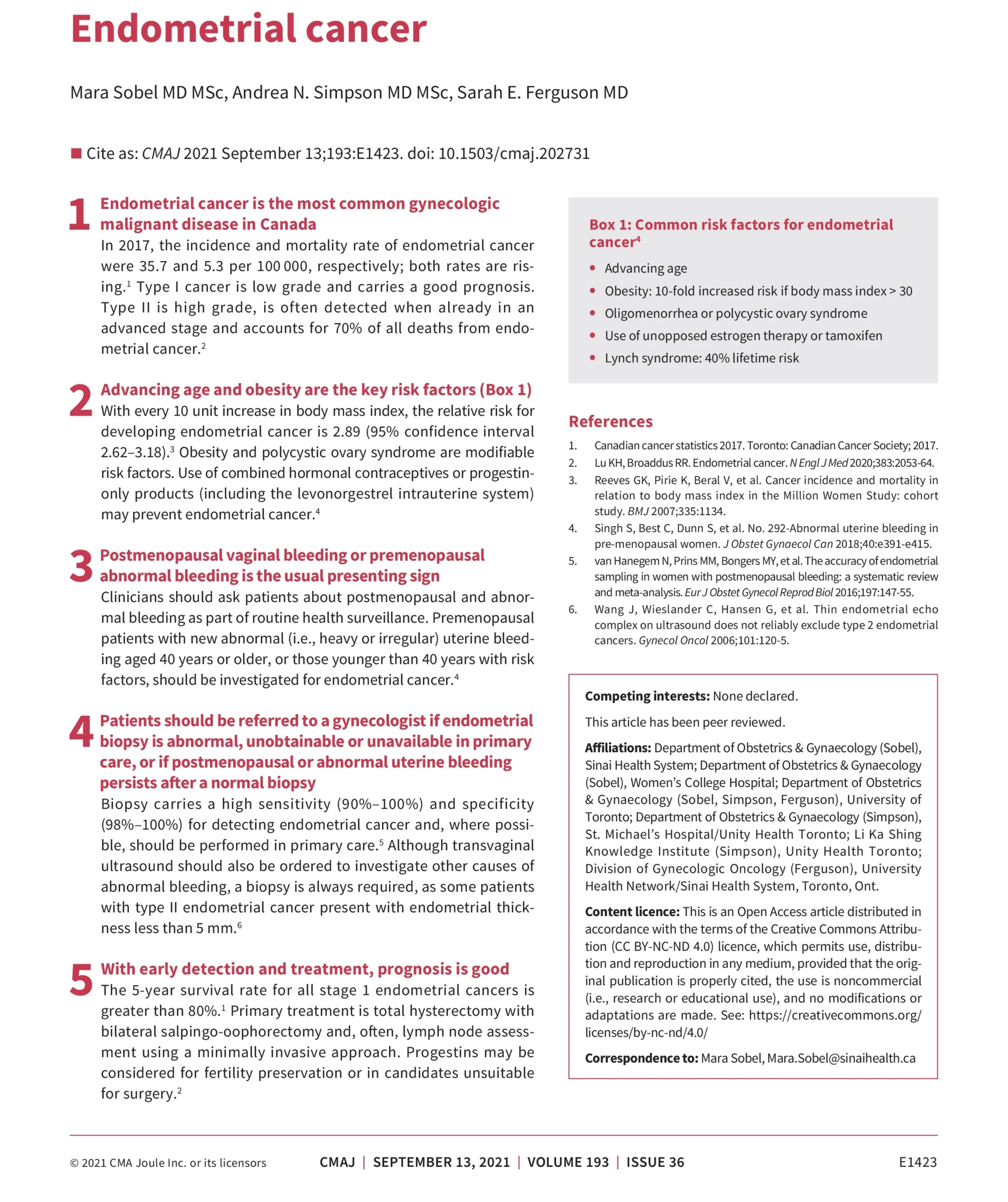 Endometrial cancer is the most common gynaecologic cancer and the 4th most common cancer overall in women. It represents 6% of all cancers in Canada. The lifetime risk of a woman developing endometrial cancer is over 3%, or 1 in 39 women in Canada.